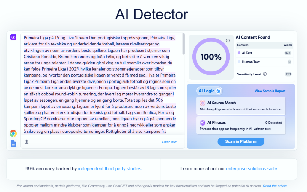 Copyleaks tilbyr en bred plattform med flere funksjoner. I praksis oppleves mange slike løsninger som mer generelle – og dermed mer ustabile – på norsk sammenlignet med spesialiserte nordiske alternativer.