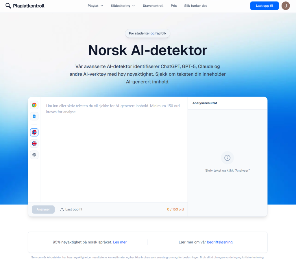 Originality.ai appellerer ofte til innholdsprodusenter og byråer. For studenttekster på norsk kan det være brukbart som bred screening, men det er ikke alltid det mest presise valget når fokus er akademisk språk og nordisk syntaks.