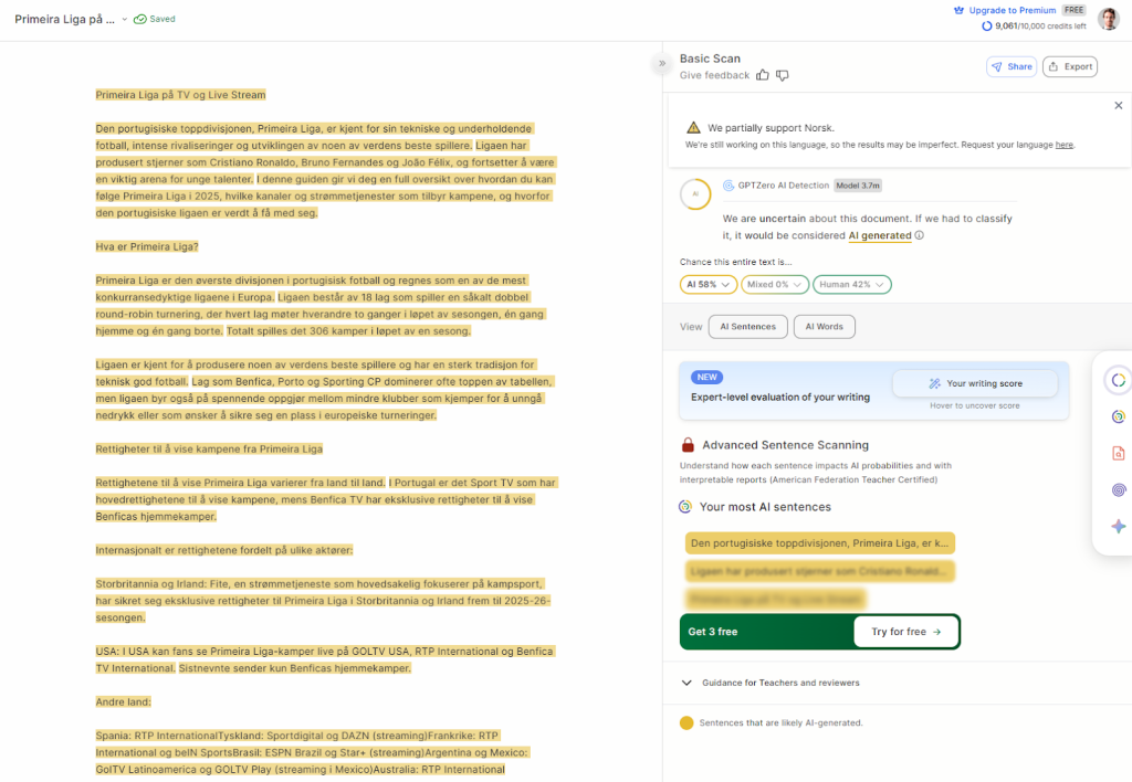 GPTZero er kjent og mye omtalt, og kan gi nyttige indikasjoner – særlig på engelsk. Utfordringen for studenter i Norge er at modellene i stor grad reflekterer engelskspråklige mønstre. Det betyr ikke at verktøyet er «dårlig», men at du bør være forsiktig med å tolke score på norsk som endelig sannhet.